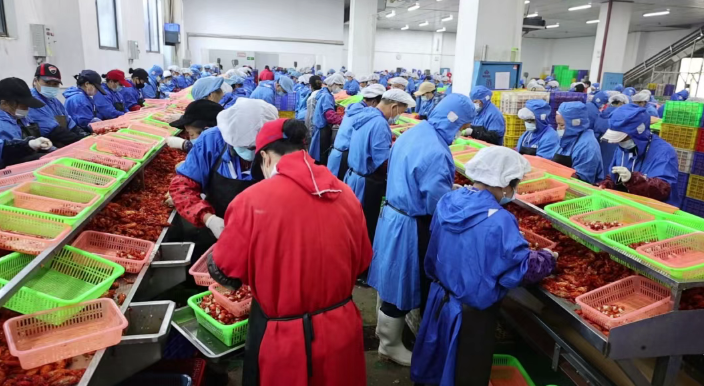 为破解传统速冻保鲜难题,提升加工效率与产品口感,企业今年斥资引进先进液氮速冻设备,通过超低温快速锁鲜技术,最大程度保留小龙虾的原汁原味与丰富营养,让产品在激烈的市场竞争中更具核心优势。当前正值销售旺季,企业 3 条生产线全天候不间断运转,工人们分工明确、各司其职,从分拣、加工到包装、入库,各个环节衔接有序、高效推进,日均加工原料虾60至80吨,虾尾、整虾两类产品持续热销,订单纷至沓来,产品远销全国各地,呈现出“产销两旺、供不应求”的良好发展态势。